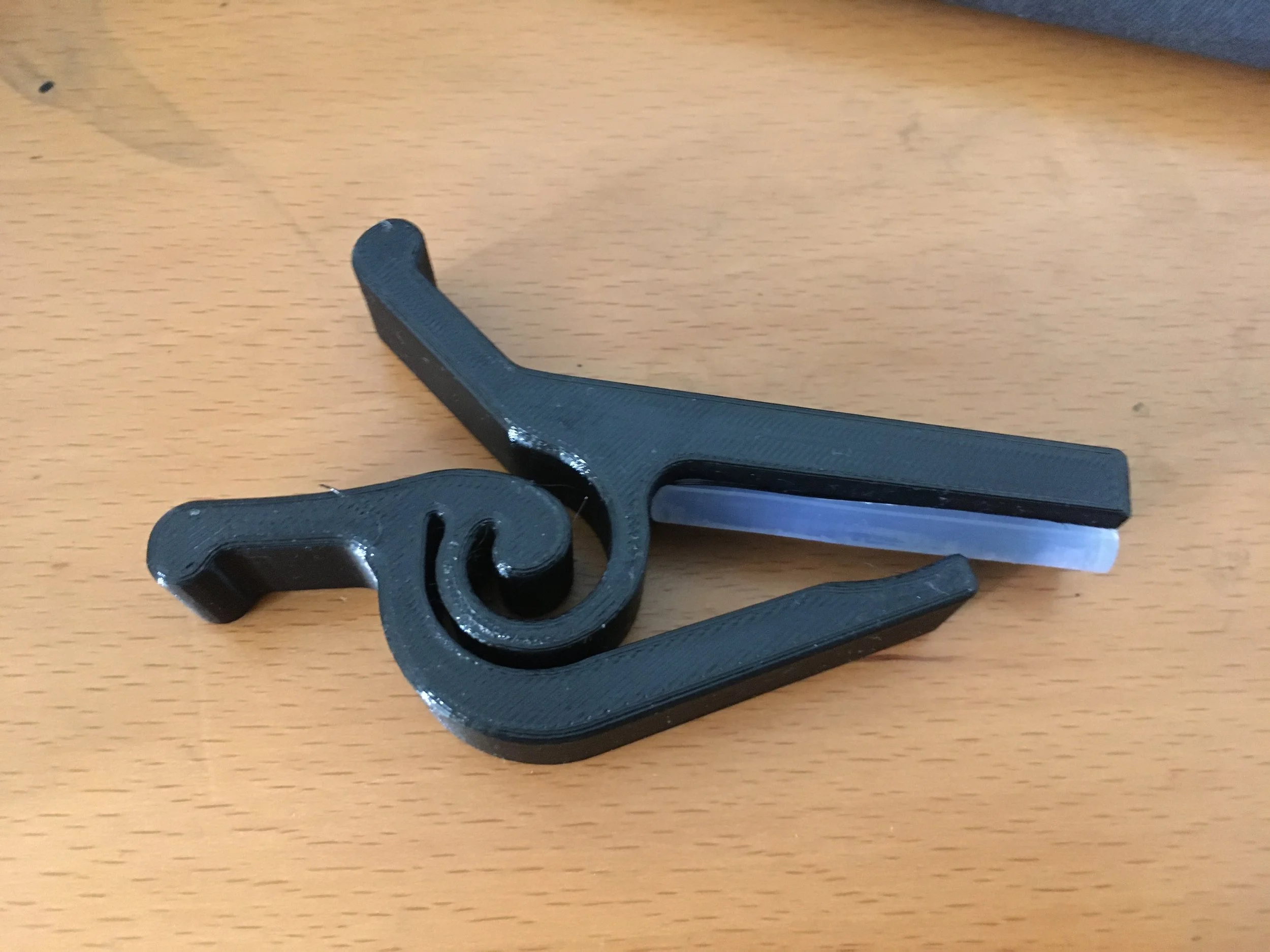 This is a guitar capo I made from 3D printing and a hot glue stick. The hot glue stick was an upgraded design from something I saw online.